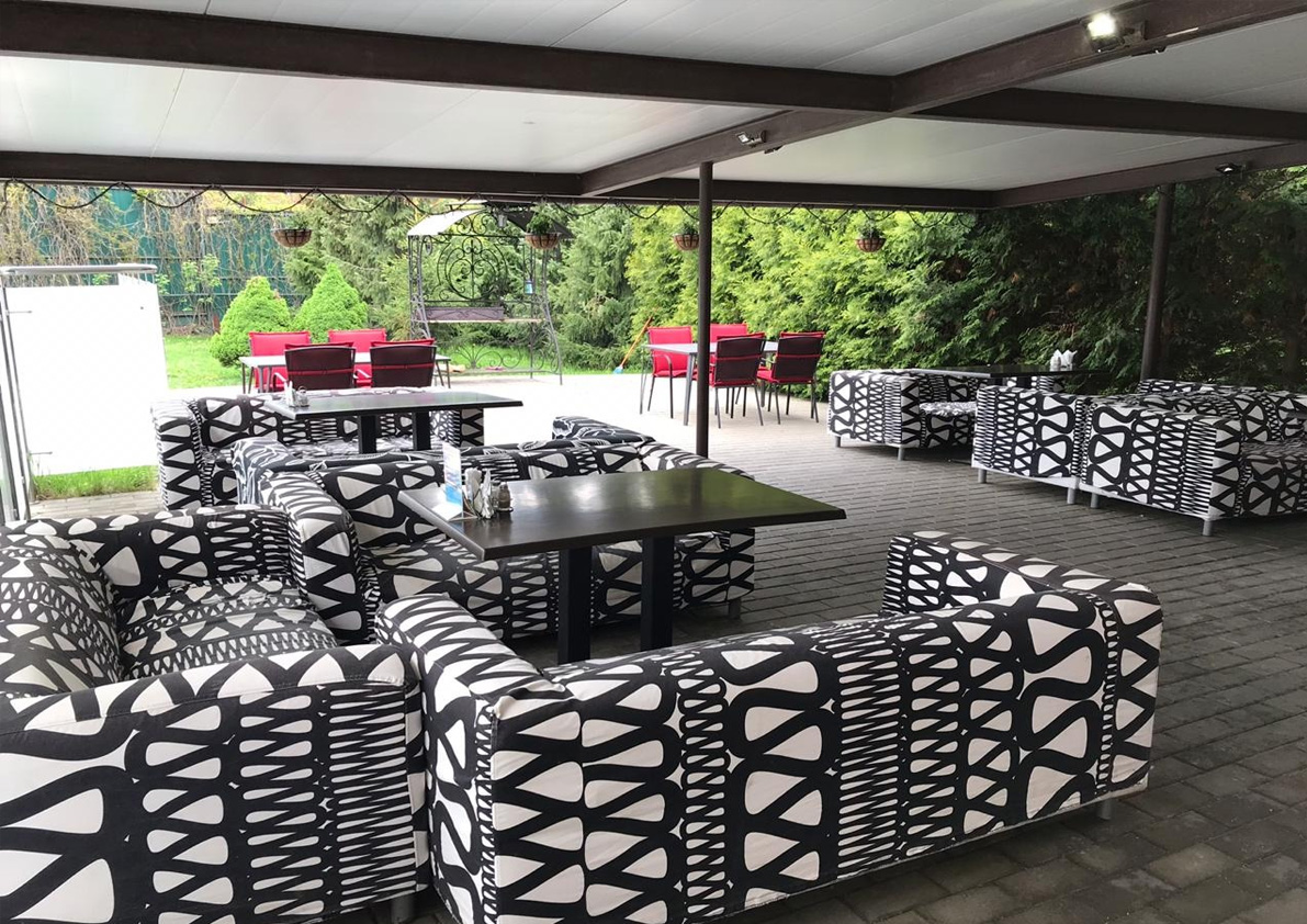 веранда с мягкими диванами, мангалом и видом на лужайку с цветами и шикарными деревьями.